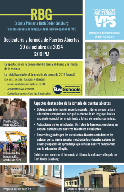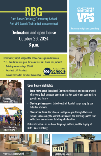 The community is invited to an open house for Ruth Bader Ginsburg (RBG) Elementary, our district’s first fully dual-language Spanish/English choice school.